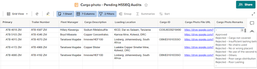 Our training curriculum equips our drivers with different techniques to use depending on the cargo to ensure optimal cargo safety as well as how they should conduct themselves during the loading, driving and offloading of the client’s cargo. Furthermore, Alistair Group has taken an extra measure that mandates drivers to take three pictures of the loaded cargo before the trip starts. These pictures are then sent to our project controller who uploads them onto the ‘Cargo Photo – Pending HSSEQ Audit’ database. This allows for our specialists in the HSSEQ department to audit the lashing, cargo distribution, sufficiency of lashing gear, placement of placards etc.
